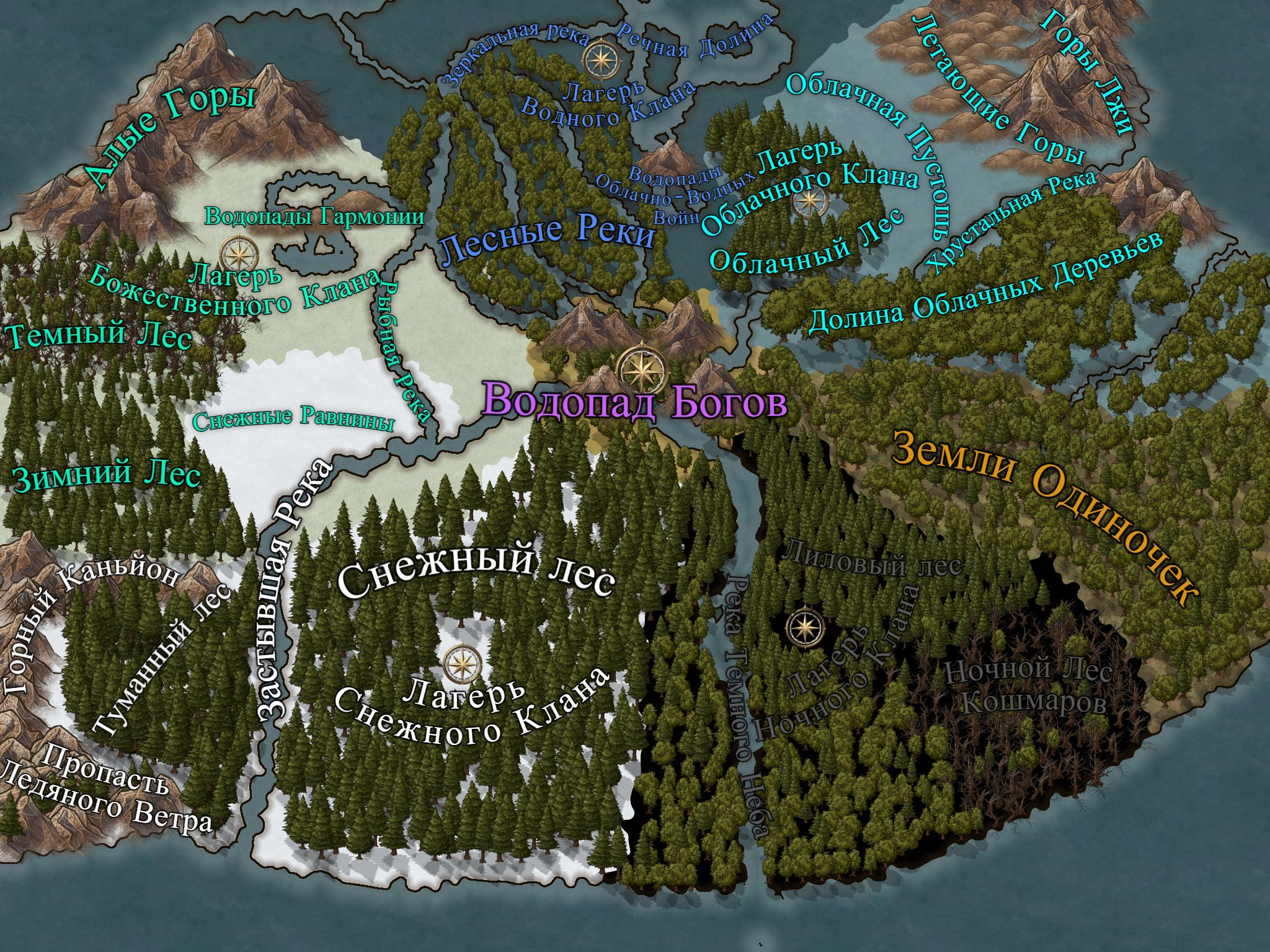 Лисьи Земли уникальны и красивы в любом, даже самом потаённом и обыденном уголке. Они красивы и прекрасны в любое время года. Зима же особое время, когда особенно страдает Водный Клан. Большинство озёр покрывается льдом, добычу становится труднее достать, чаще наступает голод. Облачному Клану тоже не особо сладко, ведь, несмотря на редкость облочной погоды, в горах добыча тоже чаще прячется, а снежные бури с летающих гор осыпаются прямо на палатки, иногда руша поталок. Божественный и Ночной Кланы особо ничем не отличаются в это время года, а вот у Снежного Клана становится больше снега, больше добычи и больше счастья ~