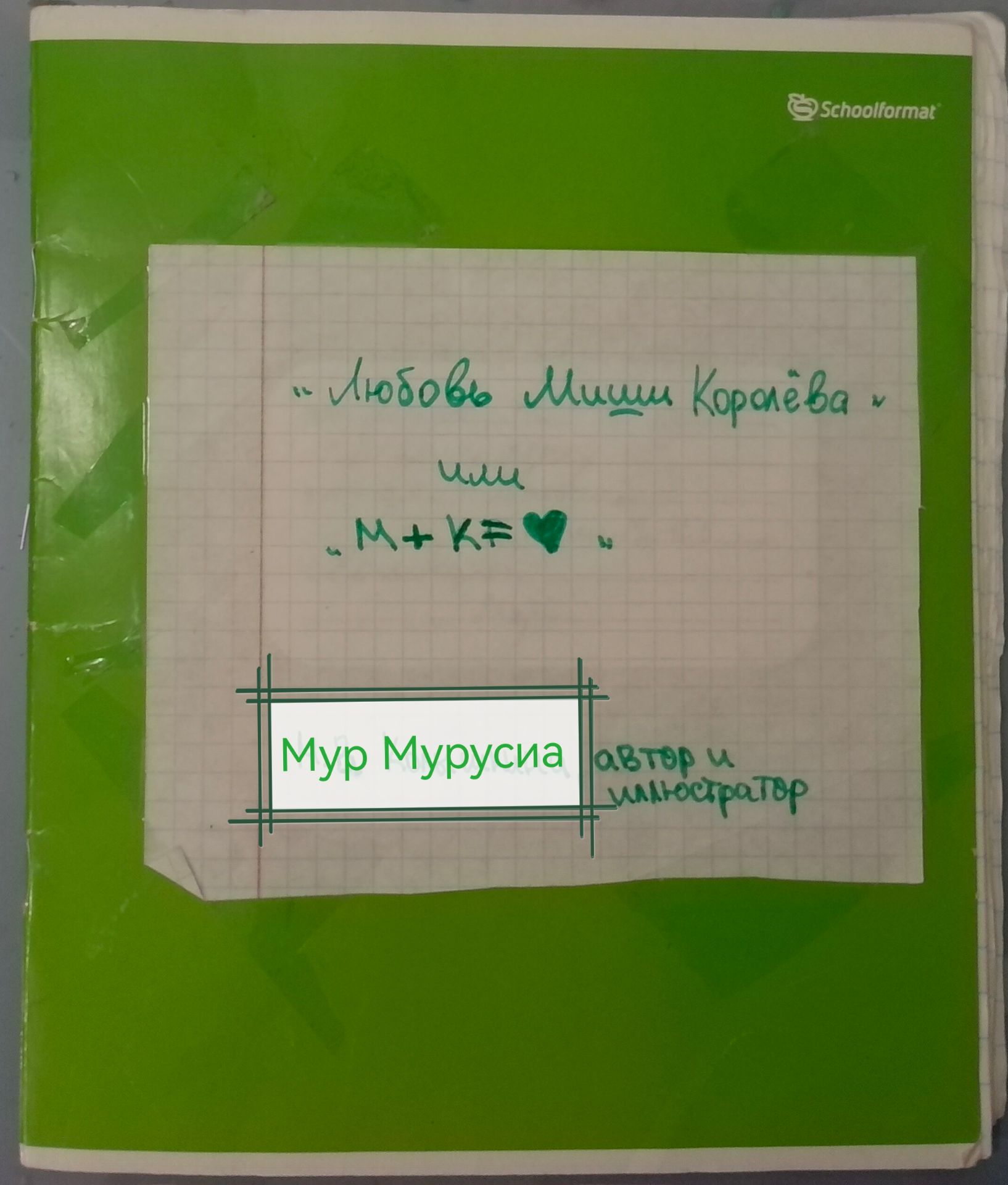 Кстати, в 10 главе Кристина что-то писала в толстую зелёную тетрадь. Это моя отсылка на само это произведение. Это реально тетрадь зелёного цвета, и мне приходилось вклеивать туда много листов, так как страниц в книге получилось... ровно 50. Вот эта тетрадь: