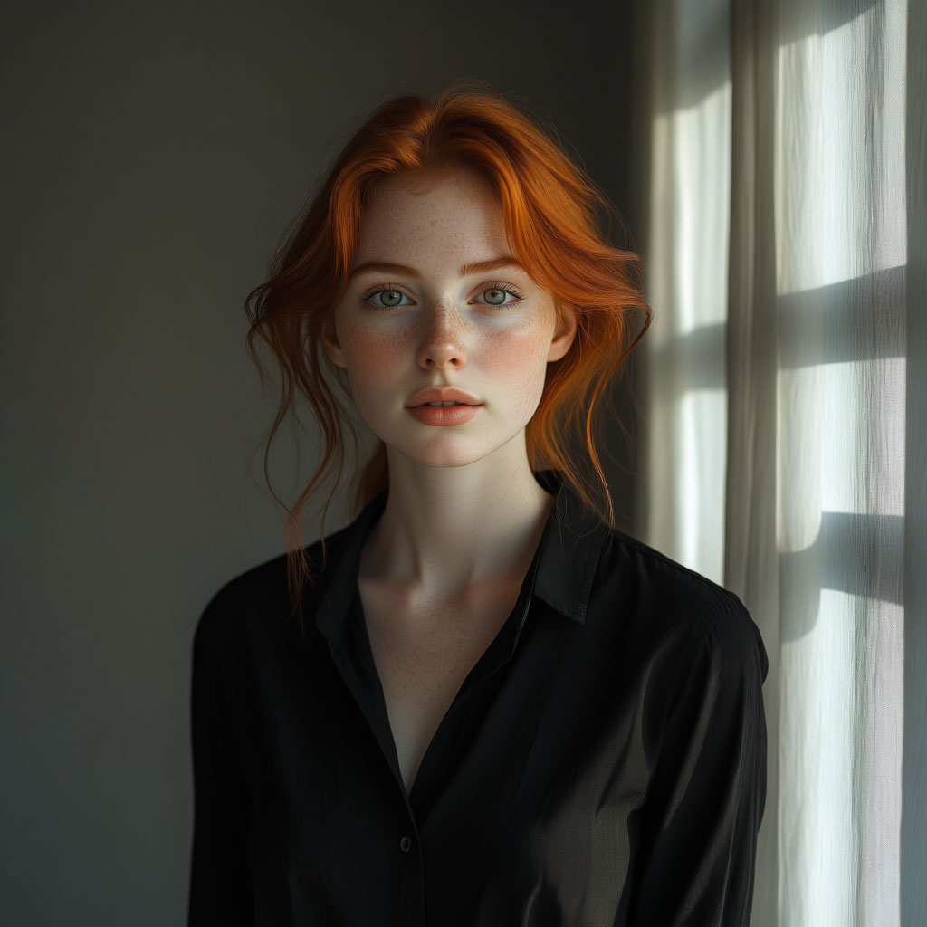 Рыжие волосы средней длины, которые обычно собраны в хвост, серые глаза. Кожа бледная, прямой нос. А одежде каких-либо предпочтений нет, но в школу постоянно ходить в черных рубашках.