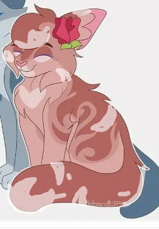 Шерсть цвета хвоста Розохвостки, розовые(как у Белой Лилии, только чуть розовее) глаза. Она всегда очаровательна, и приманивает похвалить её своей мягкой шёрсткой. Царапина на боку. Пушистая и липкая шёрстка, а также липкий розовый цветок на её голове - ну какая же красота! Ангел, а не кошка!