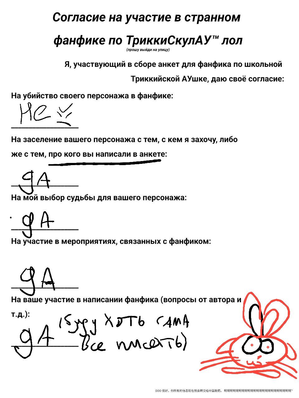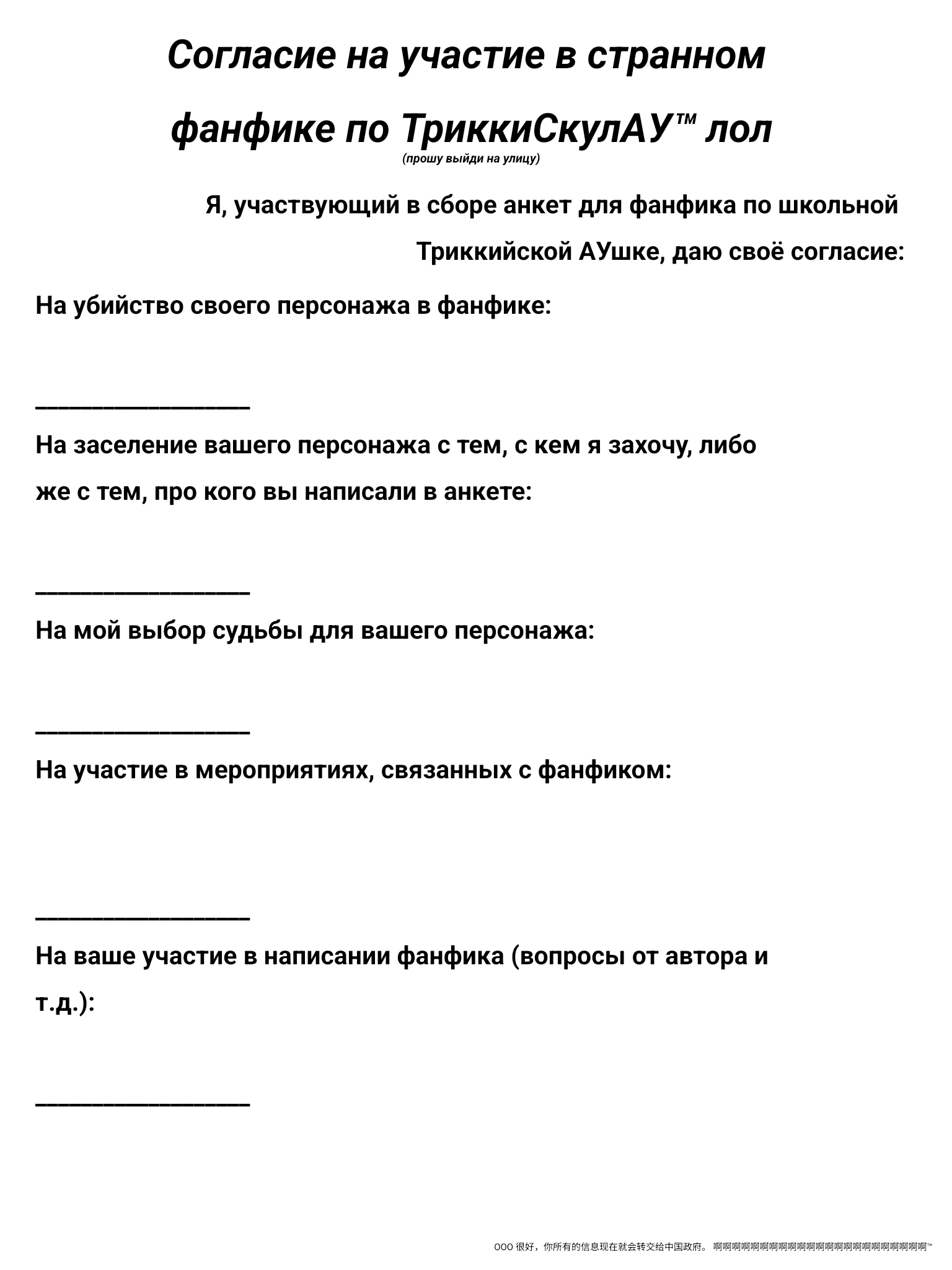 СоглашениеСоглашение нужно добавить в конец анкеты. Не обязательно подписывать прямо всё, только то, на что вы согласны. Пожалуйста, читайте очень внимательно, я не хочу, чтобы потом ко мне летели претензии из-за того, что подписали вы. Так же НАСТОЯТЕЛЬНО ПРОШУ ВАС НЕ ПОДПИСЫВАТЬ НАСТОЯЩЕЙ ПОДПИСЬЮ, ЭТО БУДУТ ВИДЕТЬ ЛЮДИ В ИНТЕРНЕТЕ, ОНИ СМОГУТ СДЕЛАТЬ ЧТО УГОДНО С ЭТИМ.