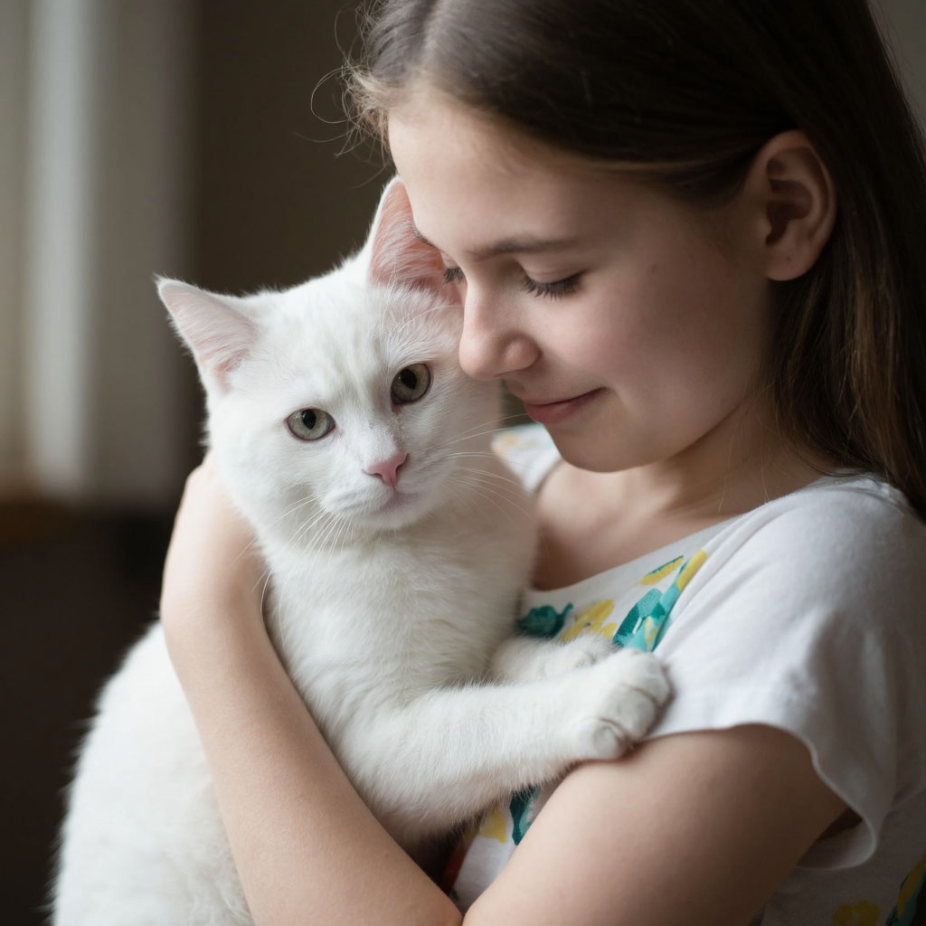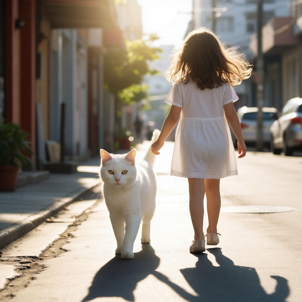 Ты белый кот. Тебя увидела девочка лет 10. Девочка поставила тебе тарелку с влажным кормом. Пахло курицей.