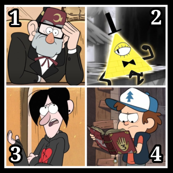 Что-ж, начнём. В этом вопросе представлены персонажи из мультсериала «Гравити Фолз».